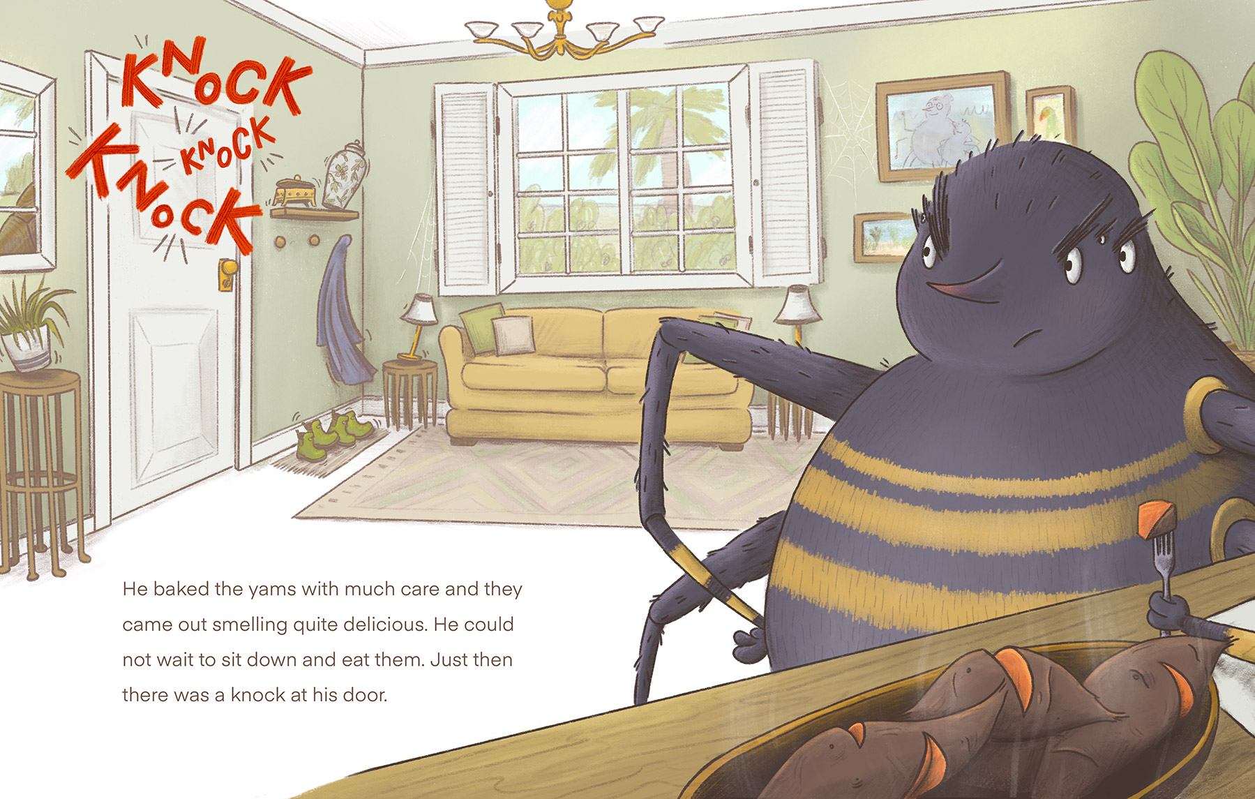 One day Anansi the spider picked some very fat and tasty yams from his garden. He baked them with much care and they came out smelling quite delicious. He could not wait to sit down and eat them. Just then there was a knock at his door...
